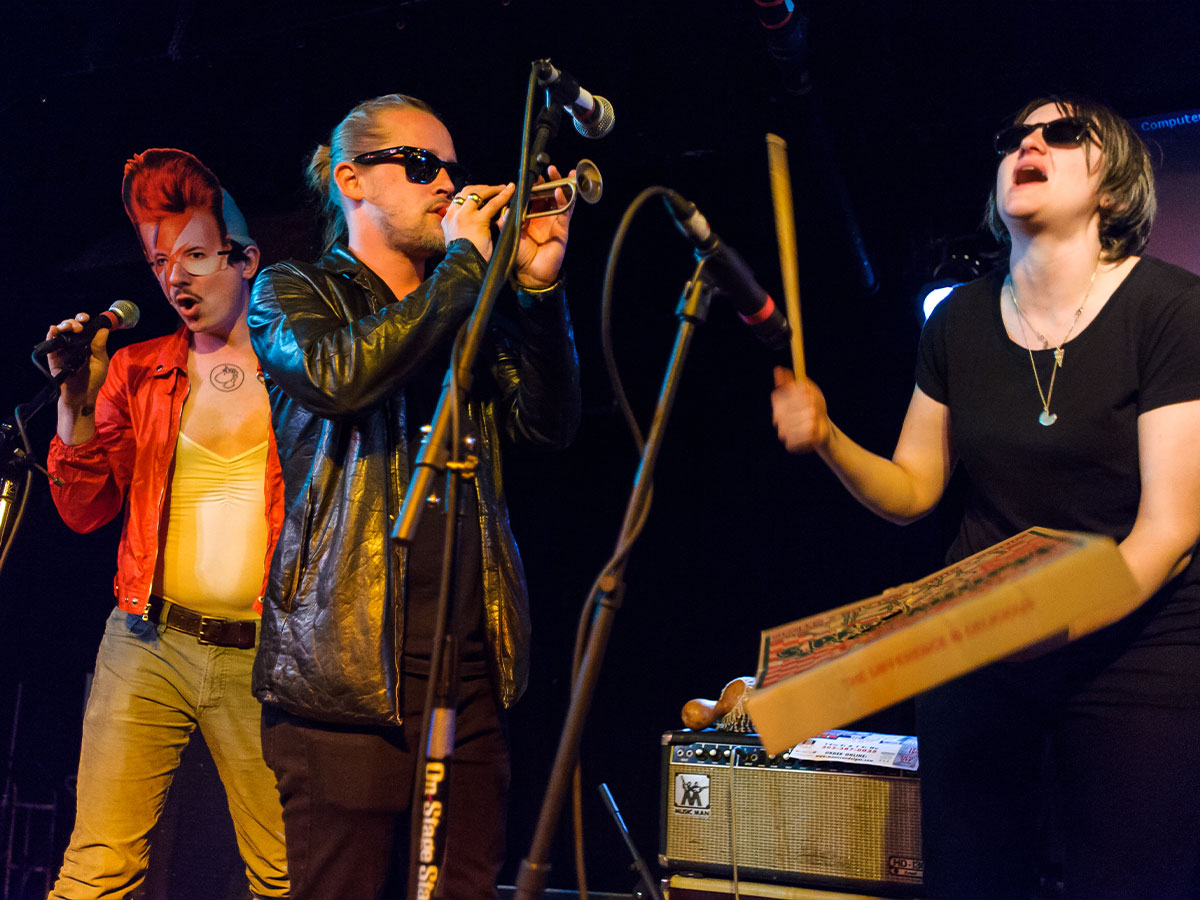Culkin band was very obligated to the pizza theme and in addition to the standart instruments, the percussionist Deenah Vollmer played on a pizza box. More than that, the band gave out boxed pizzas to people who attended their live performances.