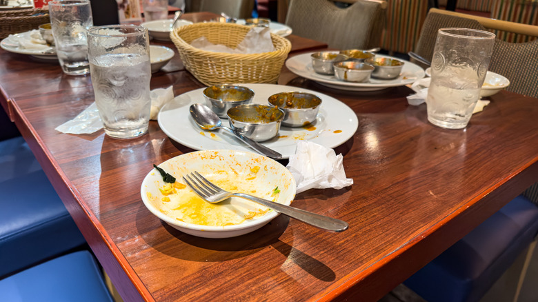 Tables should be cleared and cleaned properly between every sitting to remove all food debris, preventing bacteria growth and cross-contamination. Plus, you don't know if the person sitting there before you was sick or whether they washed their hands after using the restroom. The caveat is when it's a busy service at a restaurant where you're supposed to seat yourself. You may end up grabbing a table before someone's had the chance to clean it but as long as it's addressed quickly, it can be forgiven. I also like to scope out other food service areas of the restaurant. Is the bar top being wiped down regularly? Are staff stacking dirty dishes out in a disgusting heap on the counter? If the answer is "no," be wary.
