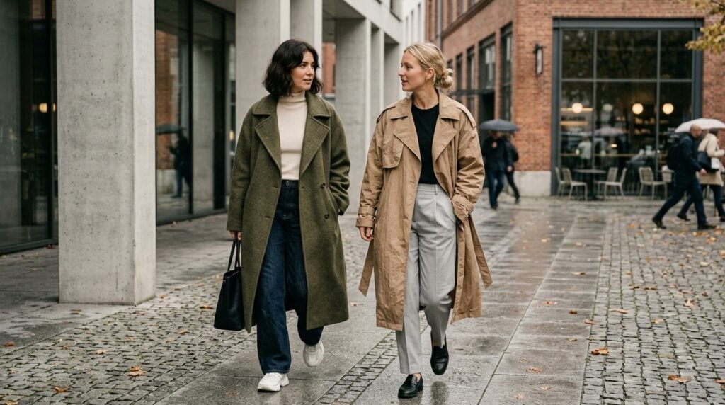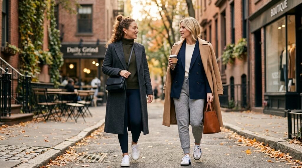 The current trend combines athletic clothing with formal apparel by combining leggings with a long wool coat. The design functions as a daily outfit because it delivers comfortable wear which maintains a polished appearance to suit both errand running and travel activities.