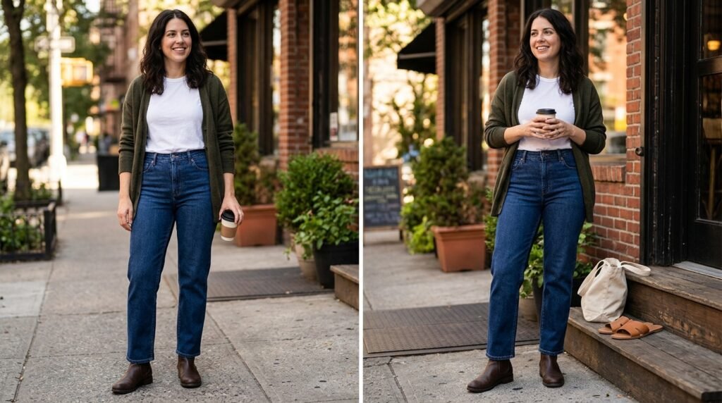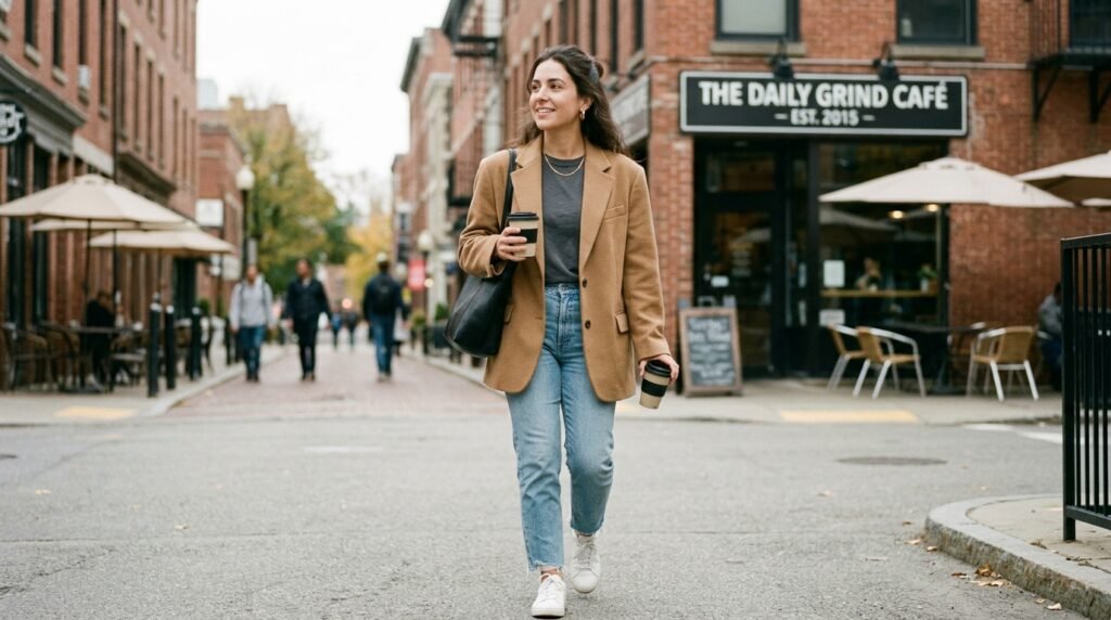 The oversized blazer creates formal structure in casual outfits through its design which takes inspiration from professional menswear and this combination of a structured blazer with a basic white t-shirt and jeans produces- a polished appearance that suits both business meetings and weekend brunches.