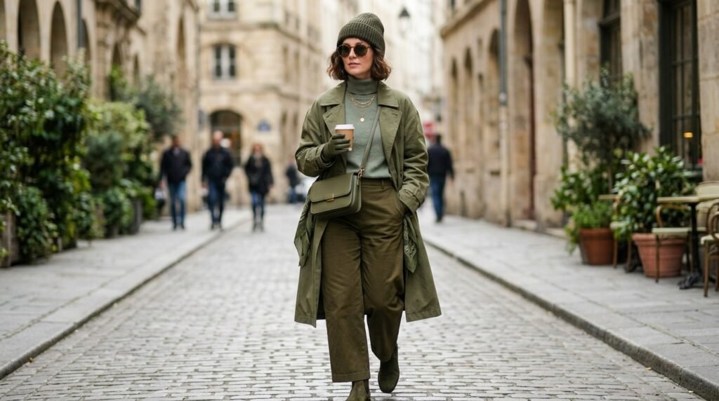 The viral technique of dressing entirely in one color from head to toe produces a slender appearance that resembles a taller body. The actual world example shows that wearing different shades of beige or forest green creates an expensive appearance which needs no complicated color matching.